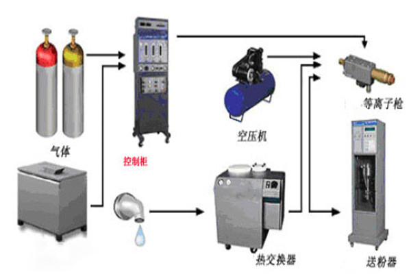 1、噴槍:實際上是一個非轉移弧等離子發生器,是關鍵的部件,其上集中了整個係統的電,氣,粉,水等。